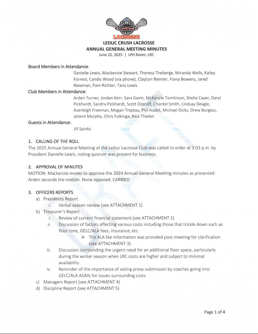 Leduc Crush Lacrosse Club Executive Meeting Minutes